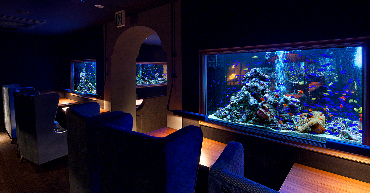 アクアリウムとラグジュアリー空間で知られる「Shinsaibashi LIME」。水槽を眺めながら過ごす時間は非日常感たっぷりで、デートや女子会に人気です。