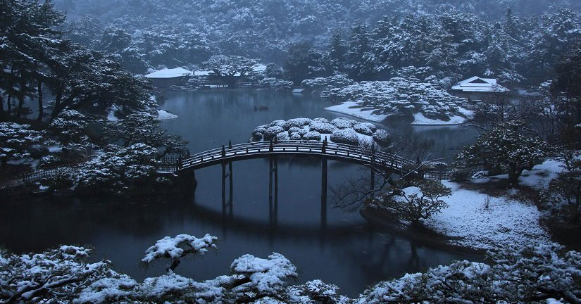 「一歩一景」と称される国指定特別名勝の大庭園。雪こそ稀ですが、静寂のなかで池や松の風情が際立つ冬は散策に最適な季節です。凛とした寒さの中、松の「雪吊り」が施される景観は、日本の美を深く感じさせます。